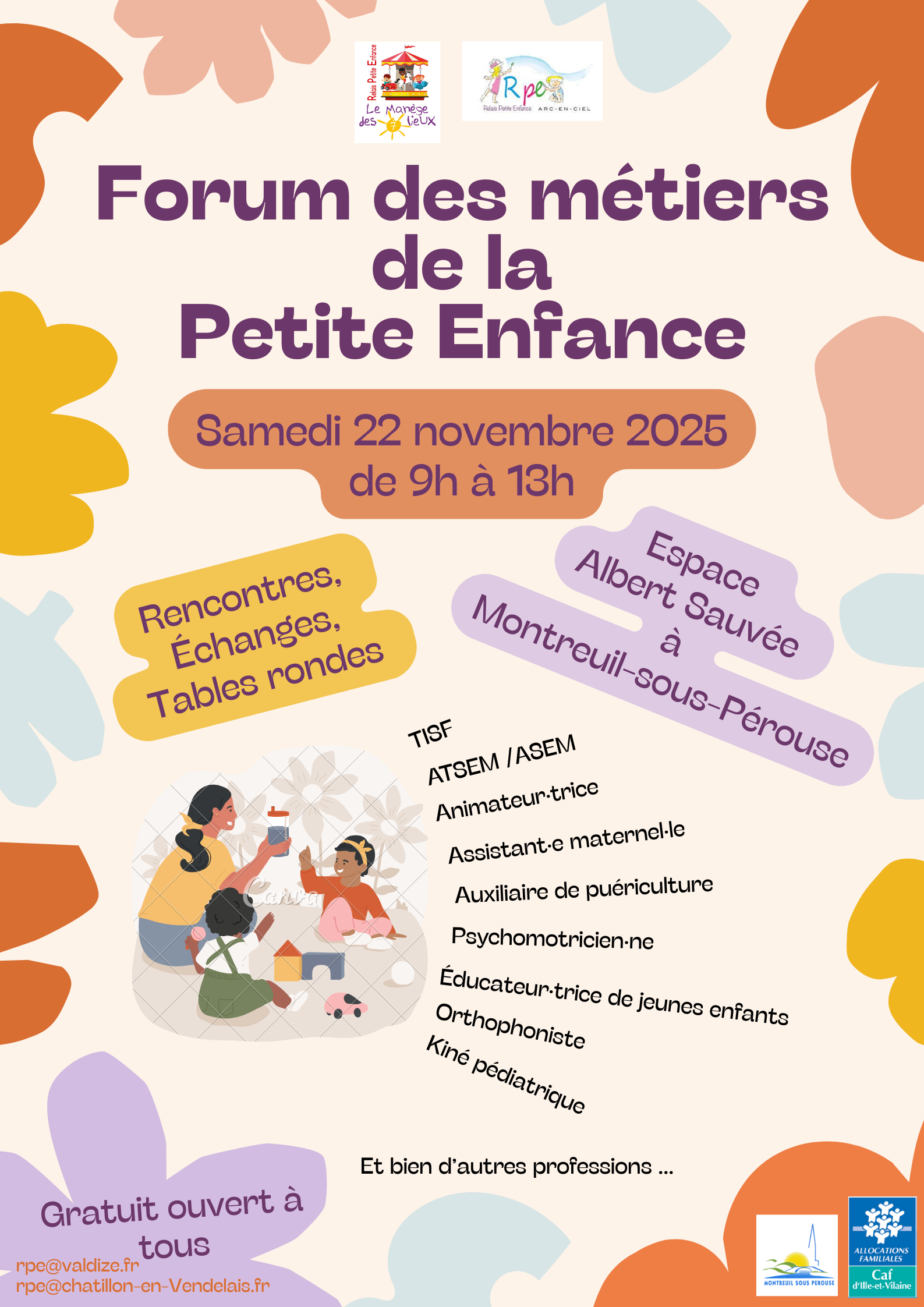Nous avons le plaisir de vous inviter à la 4ème édition du Forum des Métiers de la Petite Enfance le samedi 22 novembre de 9h à 13h à l’espace Albert Sauvée à Montreuil sous Pérouse. Il est organisé par les Relais Petite Enfance de Val d’Izé et Châtillon en Vendelais.