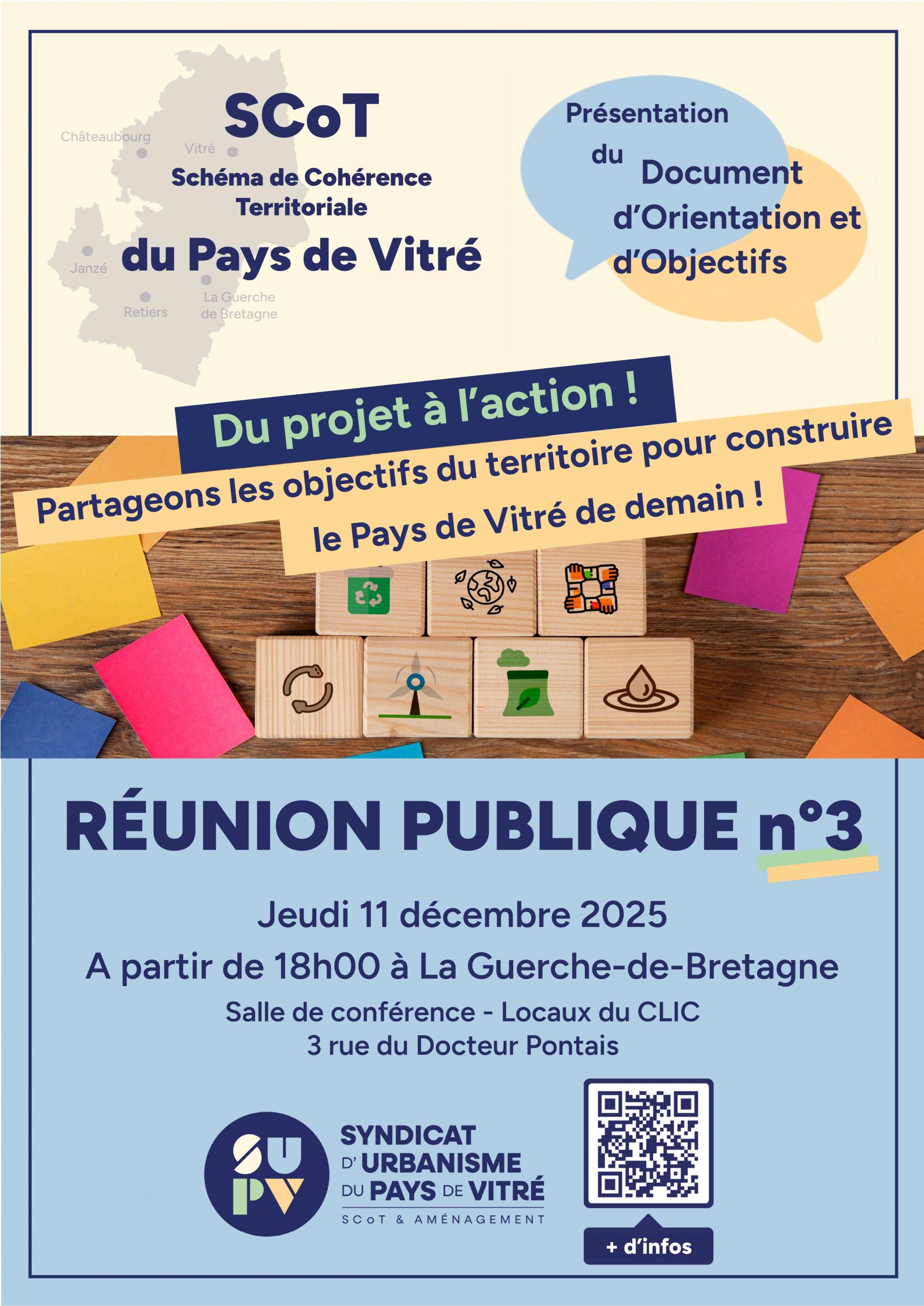 Une 3ème réunion publique sur la révision du SCoT du Pays de Vitré se tiendra le Jeudi 11 décembre prochain à partir de 18h à LA GUERCHE DE BRETAGNE (Salle de conférence – Locaux du CLIC – 3 rue du Docteur Pontais).