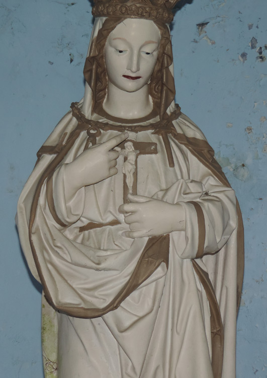Le maître-autel en bois, peint d’un faux marbre sur son emmarchement parqueté, a été transféré dans la nouvelle église où il sert, à présent, d’autel face aux fidèles.